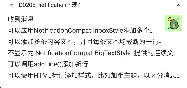 .addLine("可以应用NotificationCompat.InboxStyle添加多个简短摘要行。")